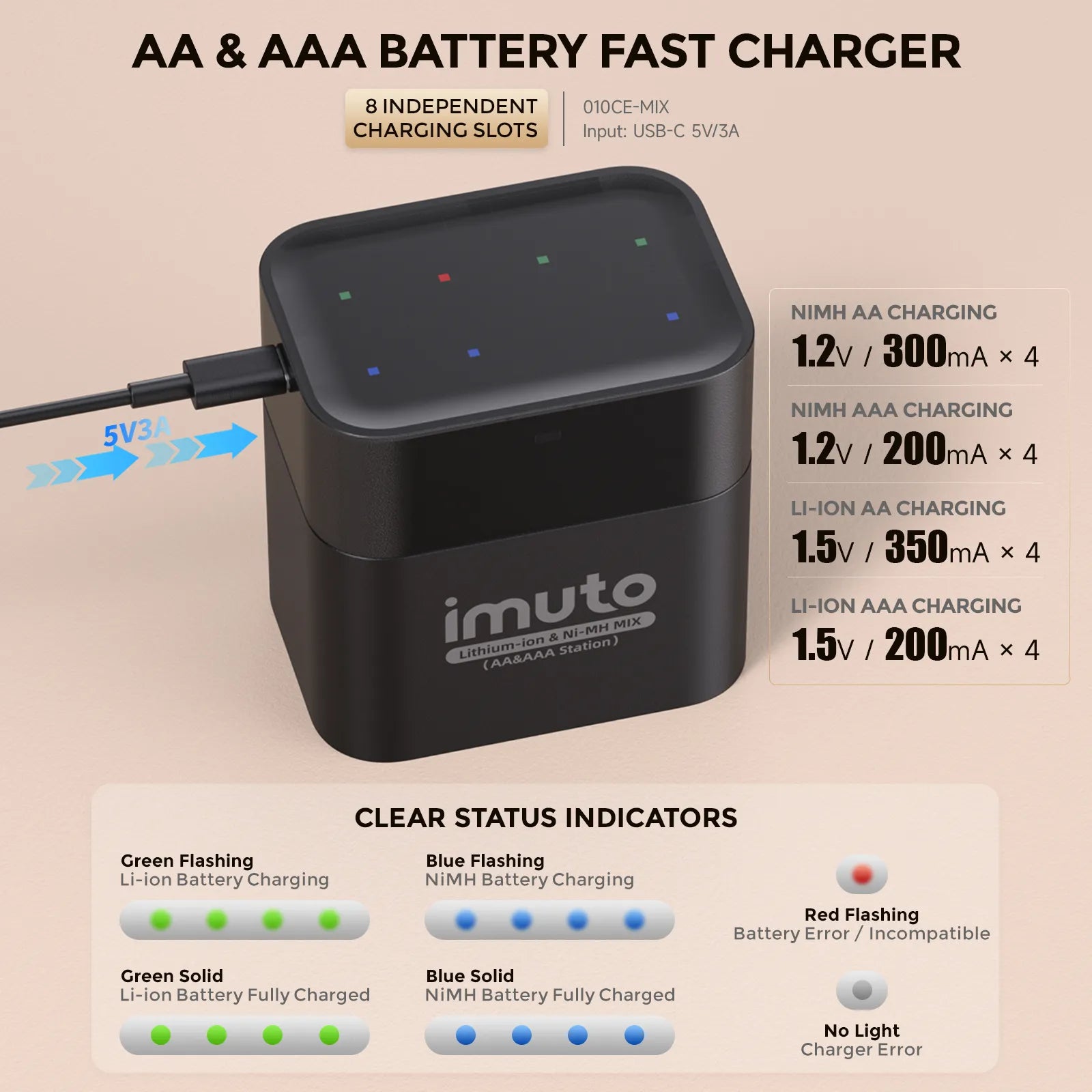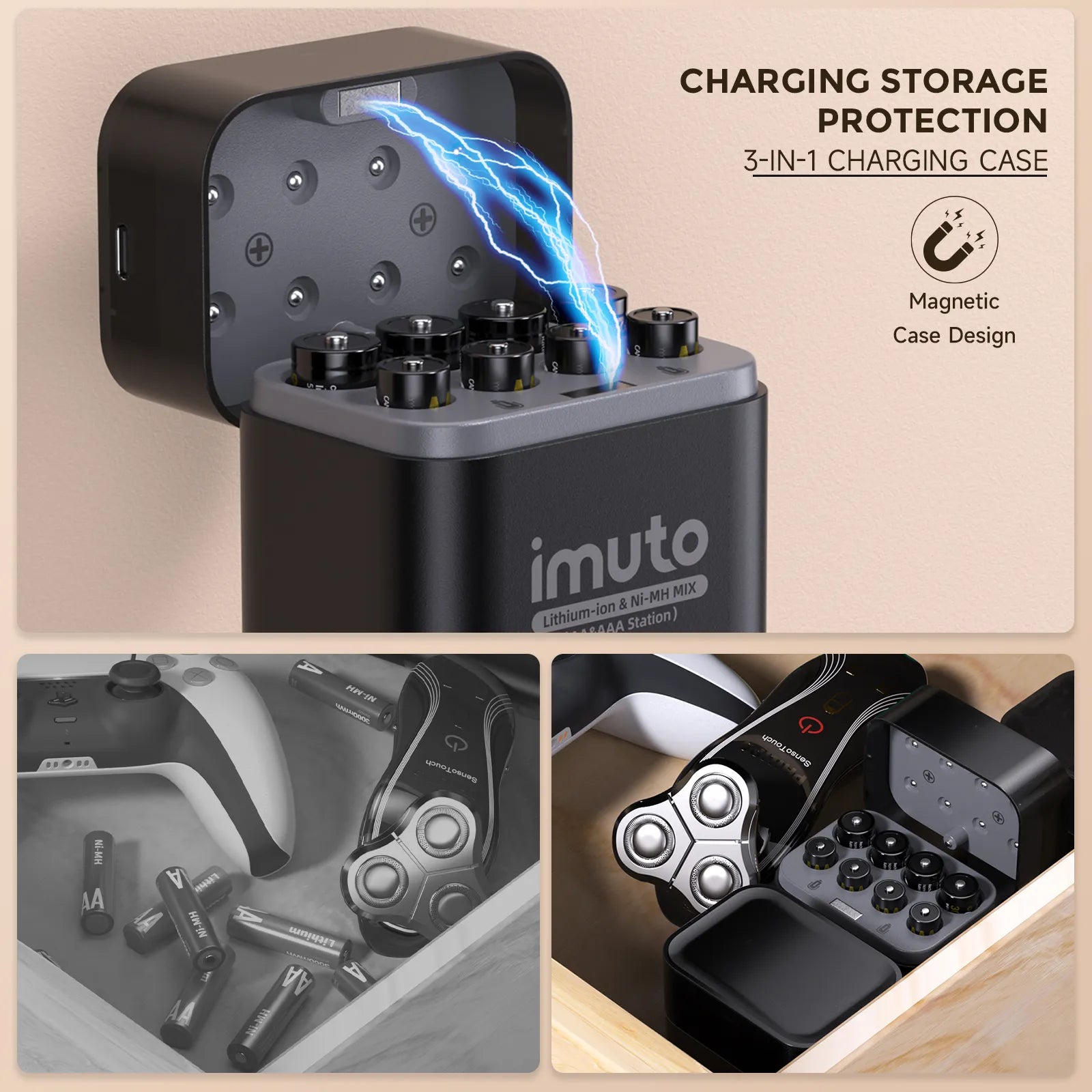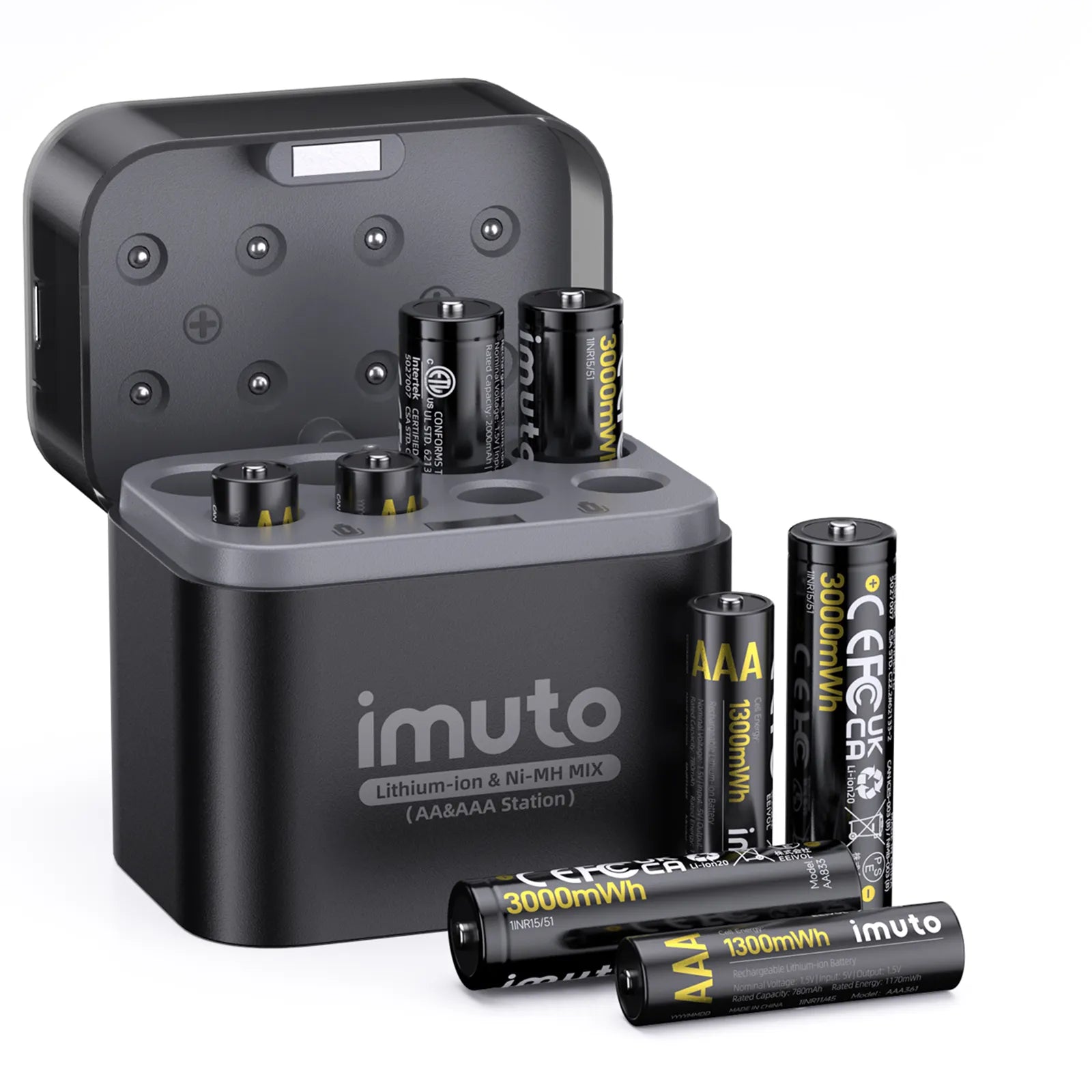 The compact charging case can charge 1–8 AA or AAA batteries at once and doubles as a neat storage box, keeping batteries organized at home or on the go.