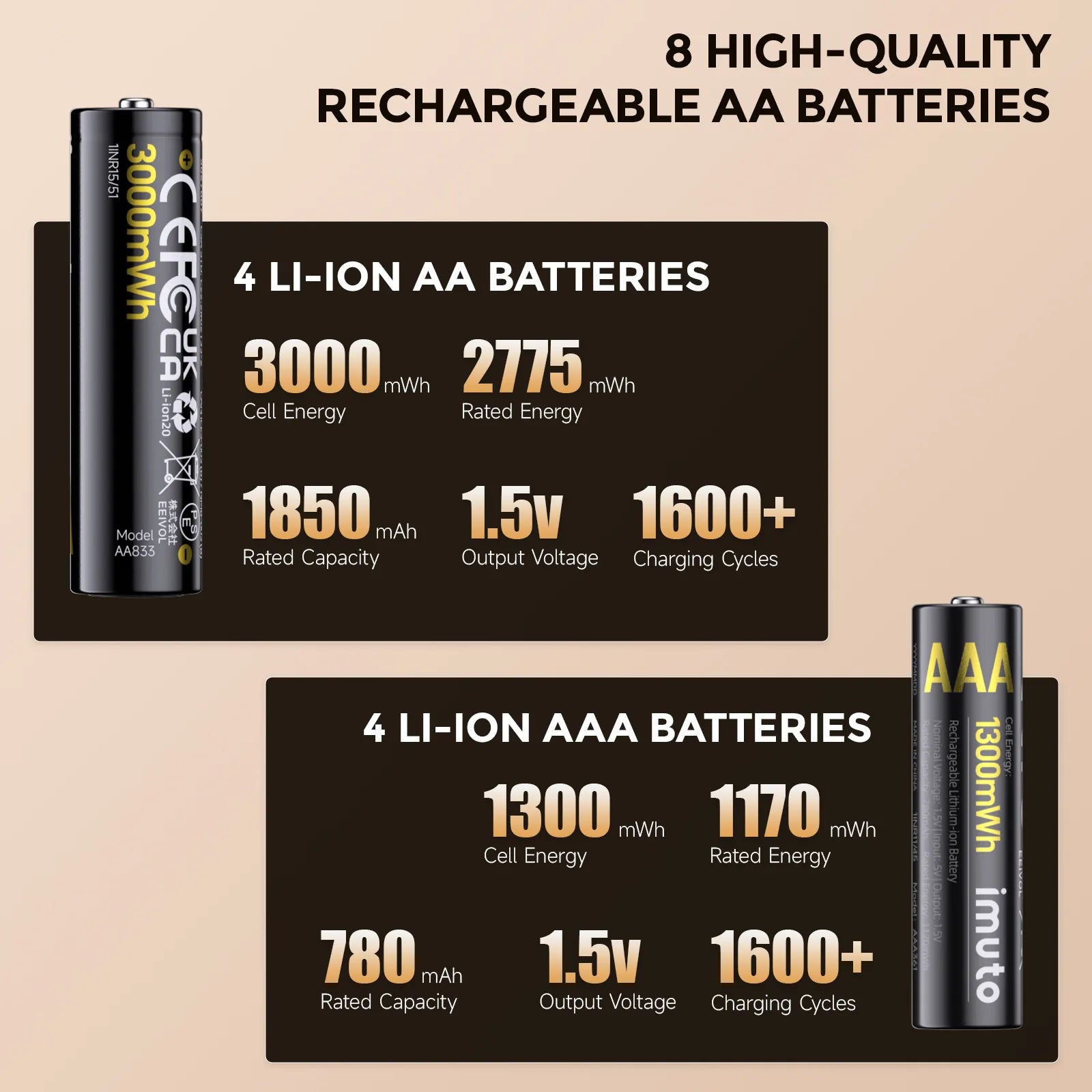 Includes 4× AA (3000mWh) and 4× AAA (1300mWh) rechargeable batteries, covering both common sizes in one convenient kit—no more guessing which battery you need.